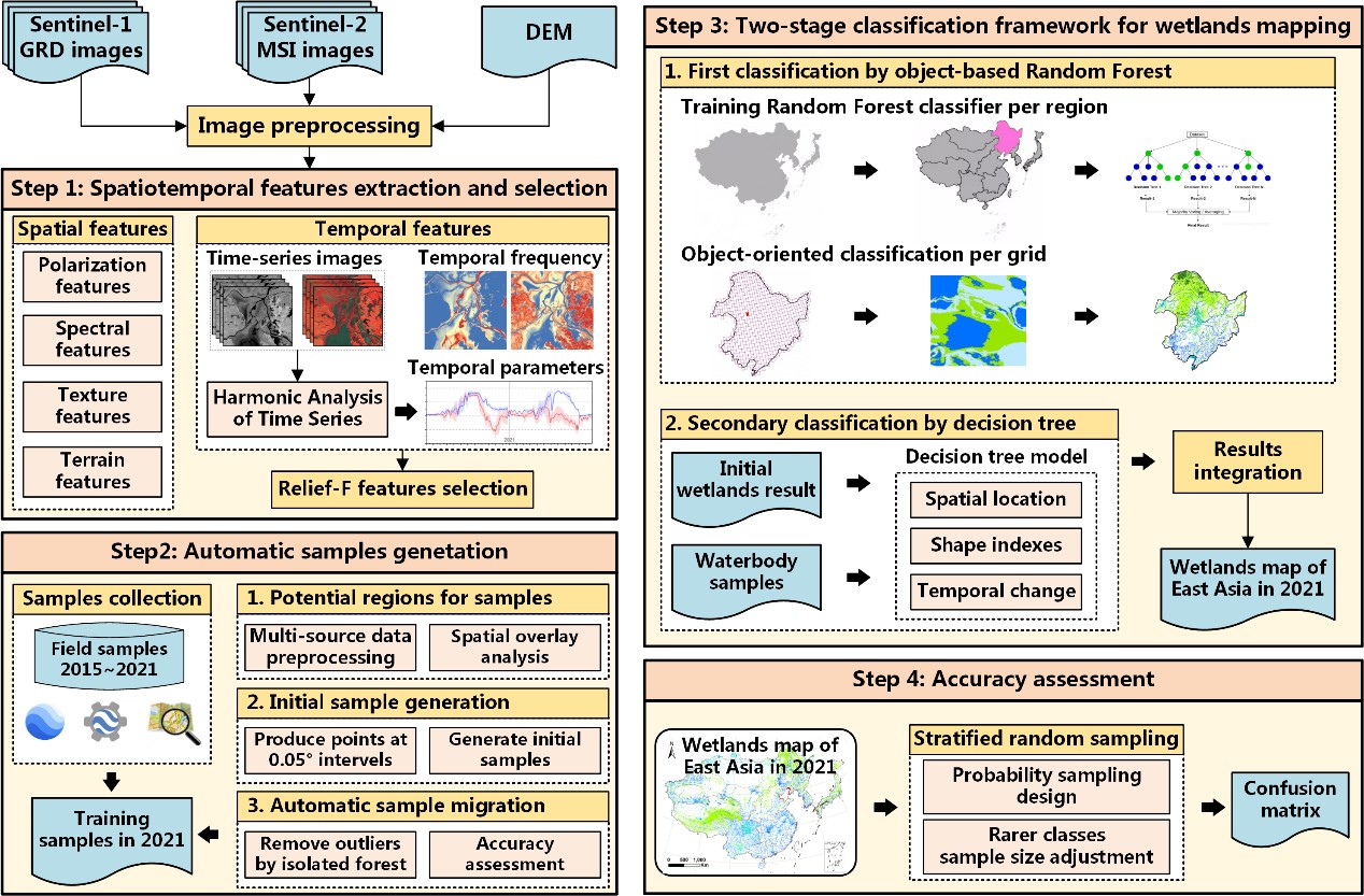針對(duì)上述問(wèn)題,在遙感大數(shù)據(jù)和云計(jì)算平臺(tái)(Google Earth Engine)的支持下,東北地理所濕地遙感、地理景觀遙感研究團(tuán)隊(duì)以東亞地區(qū)為研究范圍,研發(fā)了一種集成隨機(jī)森林機(jī)器學(xué)習(xí)算法和層次決策樹(shù)分類(lèi)算法的“兩段式”的大尺度濕地分類(lèi)框架方法。利用多源參考數(shù)據(jù)和21萬(wàn)多景Sentinel-1/2時(shí)間序列遙感影像,完成了東亞地區(qū)首套10米空間分辨率、多類(lèi)型(3大類(lèi)、12小類(lèi))的濕地空間分布圖(EA_Wetlands,2021),精度達(dá)88%以上。