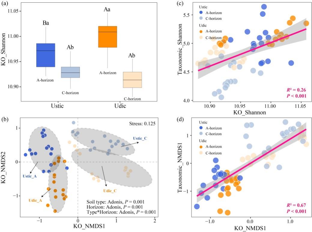 圖1 干潤和濕潤均腐土剖面微生物功能基因多樣性的變化及其與物種分類多樣性的相關性