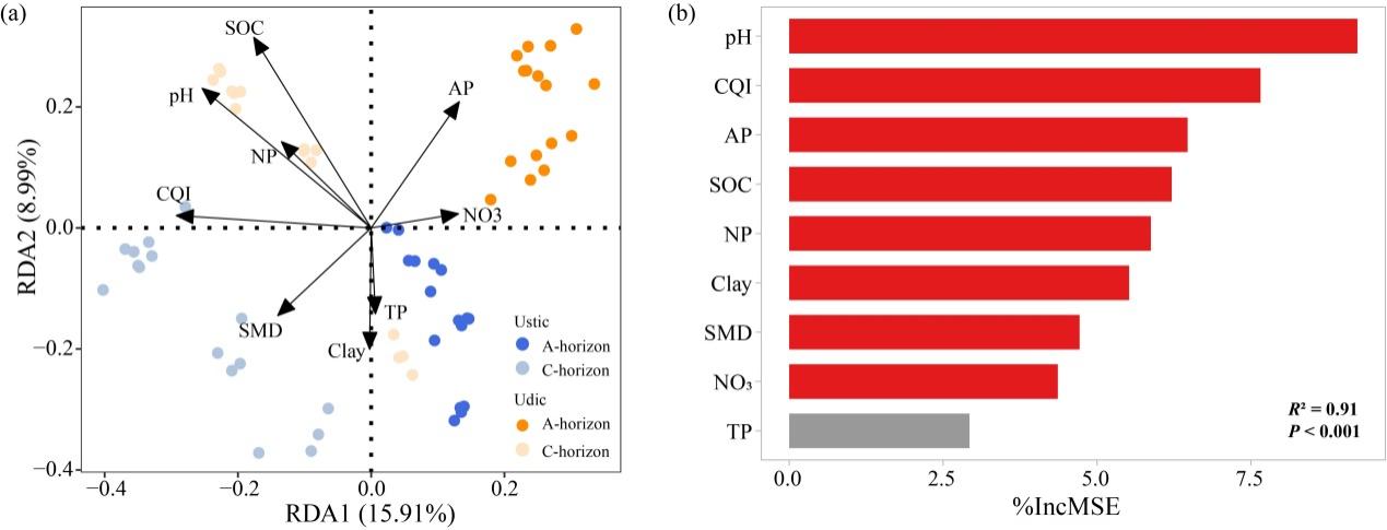 黑土是寶貴的土壤資源,在我國土壤分類系統中被命名為均腐土綱(Isohumosols),根據水分狀況進一步劃分為干潤(Ustic)和濕潤(Udic)均腐土亞綱。東北地理所農田分子生態學科組研究人員基于土壤剖面診斷層特征采集的干潤和濕潤均腐土樣本,利用宏基因組測序技術,對均腐土剖面微生物介導的碳、氮和磷循環過程基因的耦合關系進行了系統分析。結果表明均腐土剖面微生物功能基因多樣性受均腐土亞綱分類和診斷層的顯著影響,功能基因多樣性和微生物在屬水平上的多樣性呈顯著正相關關系(圖1)。冗余分析(RDA)和隨機森林模型(RF)表明土壤pH對微生物功能基因的影響最大,其次是碳質量(CQI,圖2)。相比母質層(C層)土壤,腐殖質層(Ah層)土壤的氮礦化和不穩定碳降解相關基因的相對豐度顯著增加,而土壤惰性碳降解、反硝化作用和磷循環相關基因的相對豐度顯著降低(圖3)。網絡分析結果表明,相比腐殖質層,母質層土壤的微生物功能基因相互作用更加緊密,網絡穩定性更高。本研究結果為特定微生物類群介導的生物地球化學循環耦合過程的潛在機制提供了新見解。