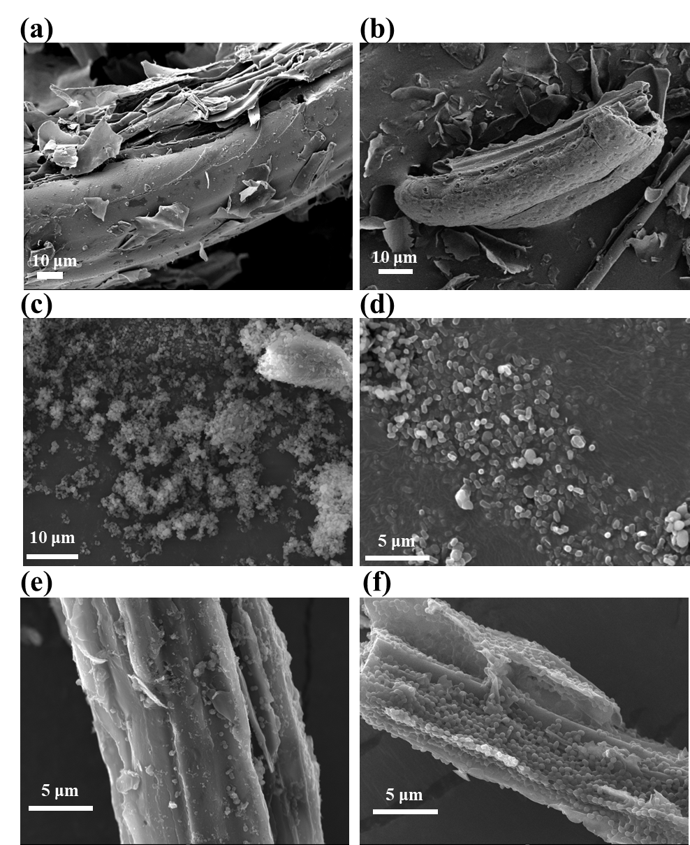 圖1 原始生物炭(a)、改性生物炭(b)、Acinetobacter YH0317(c-d)、原始生物炭負(fù)載Acinetobacter YH031(e)和改性生物炭負(fù)載Acinetobacter YH0317(f)的掃描電鏡圖像
