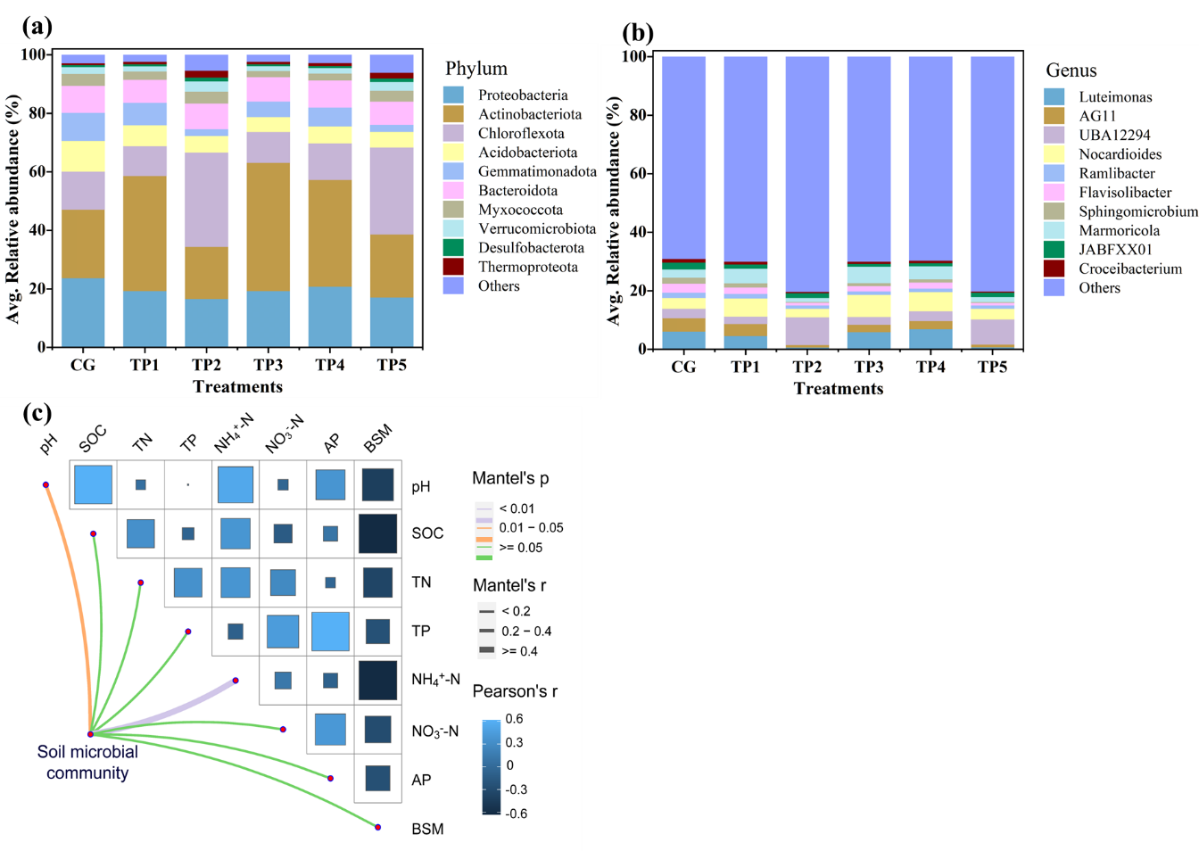 圖2 不同處理組門(a)和屬(b)水平微生物群落結(jié)構(gòu)的相對豐度;土壤微生物群落結(jié)構(gòu)與土壤性質(zhì)的相關(guān)性分析(c)