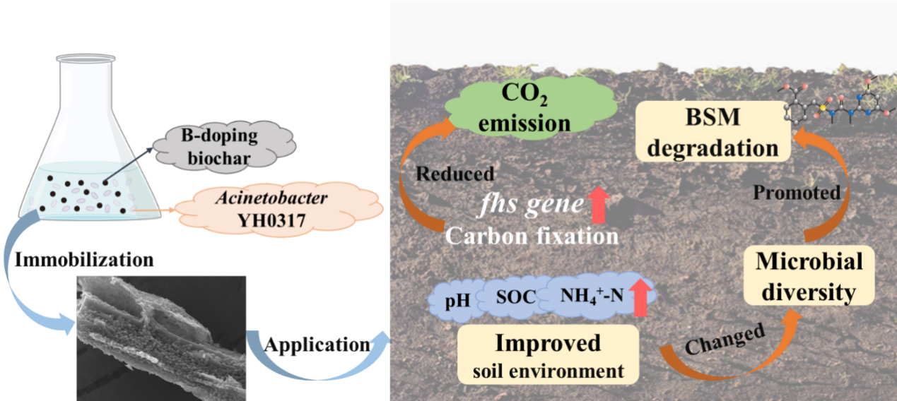 Yang Y,Kang ZC,Wang J,Xu GH,Yu Y*. Simultaneous achievement of removing bensulfuron-methyl and reducing CO2 emission in paddy soil by Acinetobacter YH0317 immobilized boron-doping biochar. Journal of Hazardous Materials,2024,467,133758.