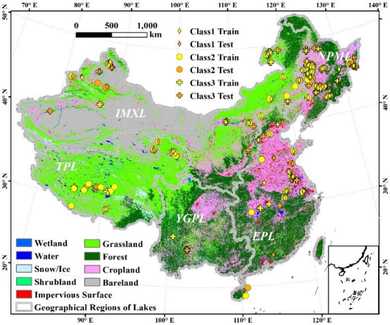 圖1 1211個(gè)測(cè)量樣本點(diǎn)的空間分布,用于校準(zhǔn)和驗(yàn)證從中國(guó)105個(gè)湖泊和水庫(kù)收集的不同分類(lèi)的模型。底圖是2020年的土地利用數(shù)據(jù)類(lèi)型。