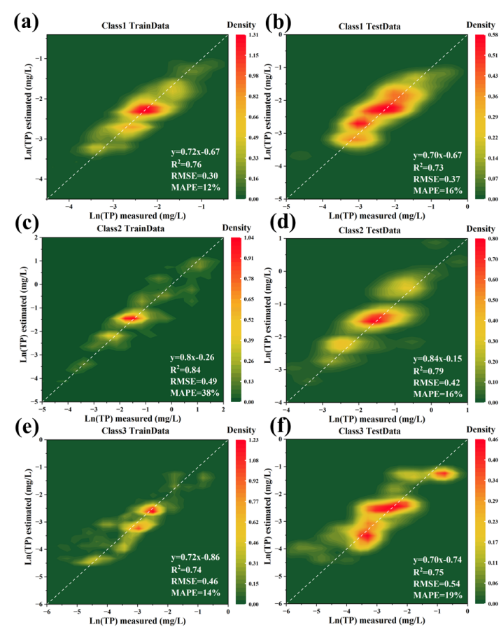 為了解決這一問(wèn)題,本研究提出了一種基于TP(Ln(TP))和B33/B9自然對(duì)數(shù)的散點(diǎn)圖雙線(xiàn)分類(lèi)方法,并將2012~2022年在中國(guó)105個(gè)湖泊和水庫(kù)進(jìn)行實(shí)地考察的1211個(gè)實(shí)測(cè)樣本分為1類(lèi)、2類(lèi)和3類(lèi)(圖1)。結(jié)果表明,所提出的分類(lèi)方法能夠增強(qiáng)Ln(TP)與43個(gè)基本潛在單波段和波段組合之間的相關(guān)性。具體而言,相關(guān)性范圍從未分類(lèi)的(-0.31,0.15)提高到第一類(lèi)的(-0.77,0.24),第二類(lèi)的(-0.81,0.36),第三類(lèi)的(-0.74,0.52)。此外,該分類(lèi)方法還改善了Ln(TP)和820波段比之間的相關(guān)性范圍,從未分類(lèi)的(-0.32,0.32)提高到第1類(lèi)的(-0.83,0.82),第2類(lèi)的(-0.16,0.86)和第3類(lèi)的(-0.56,0.86)。