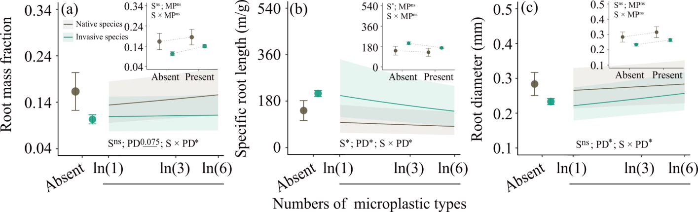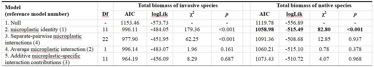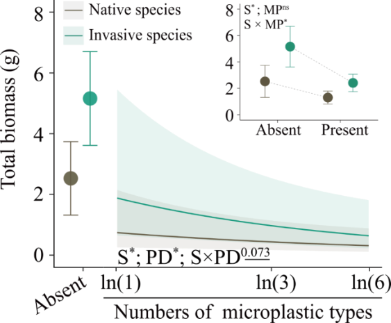 ????此外,通過hierarchical diversity-interaction 模型發(fā)現(xiàn),微塑料多樣性對(duì)外來入侵植物總生物量的負(fù)面影響既受微塑料性質(zhì)的影響,也受某些類型微塑料的影響,兩者之間存在強(qiáng)烈的配對(duì)相互作用。相比之下,對(duì)本地植物的影響則完全取決于微塑料性質(zhì)(表1)。