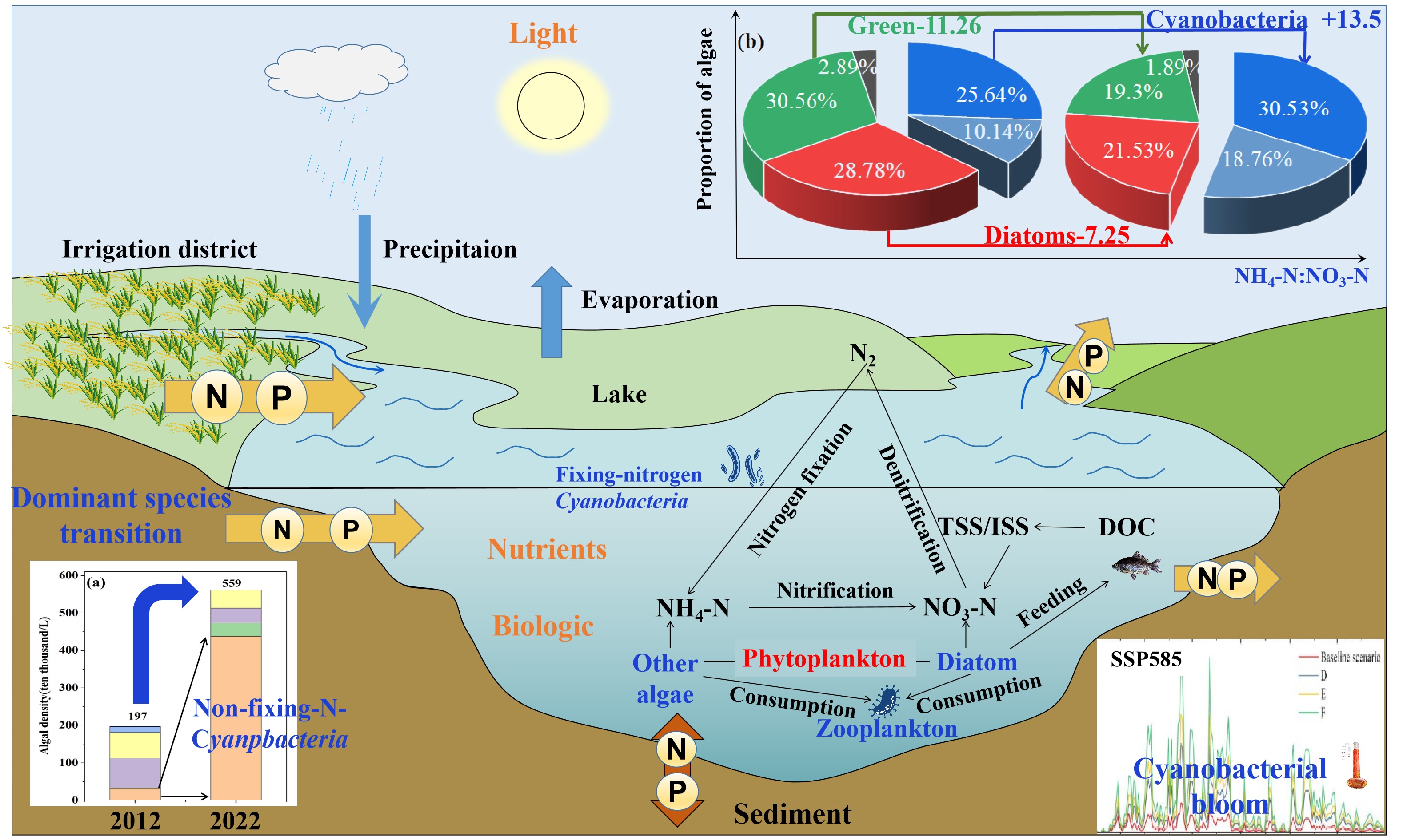 結果表明:2012-2022年,查干湖浮游植物優勢種從硅藻轉變為藍藻(圖1)。基于結構方程模型解析了這一演替的主要環境變量包括水溫、總氮(TN)、總磷(TP)和氨氮(NH4-N)以及總懸浮顆粒物(TSS)。為了進一步探索浮游植物演替的驅動機制及其對氣候變化的響應,我們構建了一個綜合的水動力-水質-藻華綜合模型來模擬多環境因子作用下各類型浮游植物生物量的演變(圖2)。發現了營養物質的不同比例決定了浮游植物優勢物種的演替。在渾濁水體中,高NH4-N:NO3-N比值有利于藍藻生長,抑制硅藻生存。此外,硅藻(30.77%vs22.28%)和綠藻(30.56%vs23.30%)的生物量比例急劇下降。相比之下,隨著NH4-N:NO3-N比值的增加,藍藻豐度顯著增加(35.78%-51.71%)。此外,當TN:TP≥20和NH4-N:NO3-N≥10時,非固氮藍藻生物量占比高于固氮藍藻。值得注意的是,在SSP585情景下,氣溫上升3.0℃時,藍藻生物量達到基線情景的3-6倍。我們強調了氮形態對浮游植物優勢種演替的影響,氣候變暖將增強氮形態對優勢種轉變的驅動作用(圖3),為控制藍藻水華提供了科學依據。