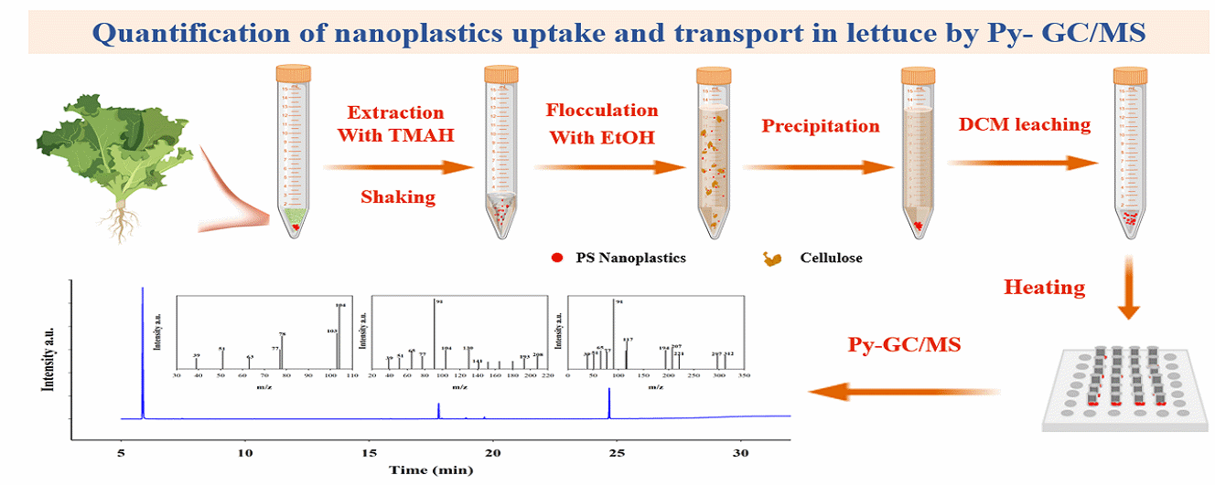 在日益嚴(yán)峻的環(huán)境污染挑戰(zhàn)中,微塑料(MPs)與納米塑料(NPs)作為新污染物,已廣泛分布于自然環(huán)境中,威脅著陸地生態(tài)系統(tǒng)健康。環(huán)境中的NPs質(zhì)量較低,難以精確檢測,其環(huán)境風(fēng)險評估一直面臨技術(shù)瓶頸。東北地理所環(huán)境生態(tài)學(xué)科組研究團(tuán)隊(duì)通過優(yōu)化提取程序和儀器的熱裂解溫度,成功開發(fā)出一種基于熱裂解氣相色譜質(zhì)譜(Py-GC/MS)鑒定和定量植物中納米塑料的方法,有效解決了這一問題[1]。該方法具有高度靈敏、操作簡便的優(yōu)點(diǎn),并且避免了金屬標(biāo)記元素對植物的干擾。已成功將該方法應(yīng)用于生菜對納米塑料吸收情況的量化研究。