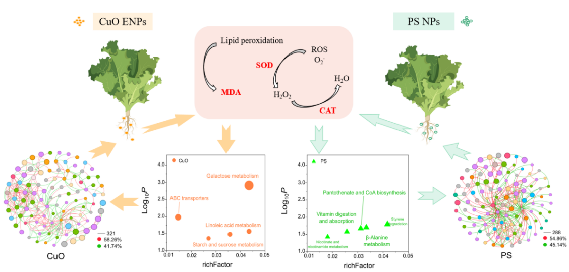 在建立分析方法的基礎(chǔ)上,該團(tuán)隊(duì)對比并揭示了NPs和工程納米顆粒物(ENPs)對生菜的差異作用機(jī)制[2]。研究發(fā)現(xiàn),暴露于NPs和ENPs的生菜中,氧化銅(CuO)ENPs引起的生菜膜損傷最為嚴(yán)重,根系通過上調(diào)半乳糖代謝和改變亞油酸代謝對CuO做出響應(yīng),而暴露于NPs的根系通過調(diào)節(jié)氨基酸、輔因子和維生素代謝應(yīng)對NPs脅迫。這些代謝途徑的改變進(jìn)一步調(diào)節(jié)了CuO和NPs對根際微生物的不利影響。