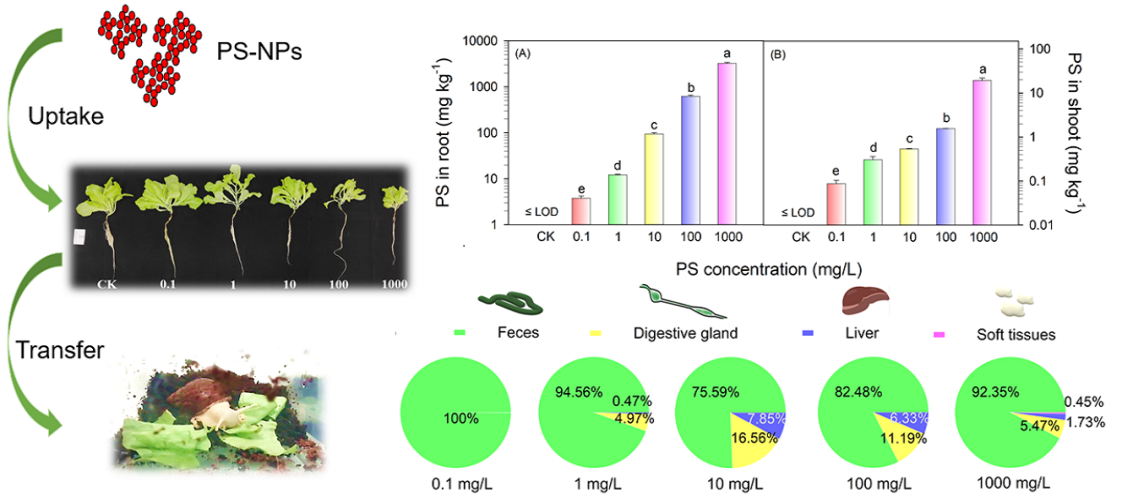 此外,該團(tuán)隊(duì)進(jìn)一步評估了NPs在食物鏈中的傳遞風(fēng)險,首次基于質(zhì)量濃度量化了NPs在生菜-蝸牛食物鏈中的營養(yǎng)轉(zhuǎn)移[3]。結(jié)果發(fā)現(xiàn),NPs的暴露濃度影響其在生物體內(nèi)的營養(yǎng)轉(zhuǎn)移和生物分布,對直接暴露的生菜和間接暴露的蝸牛產(chǎn)生了不同程度的影響。