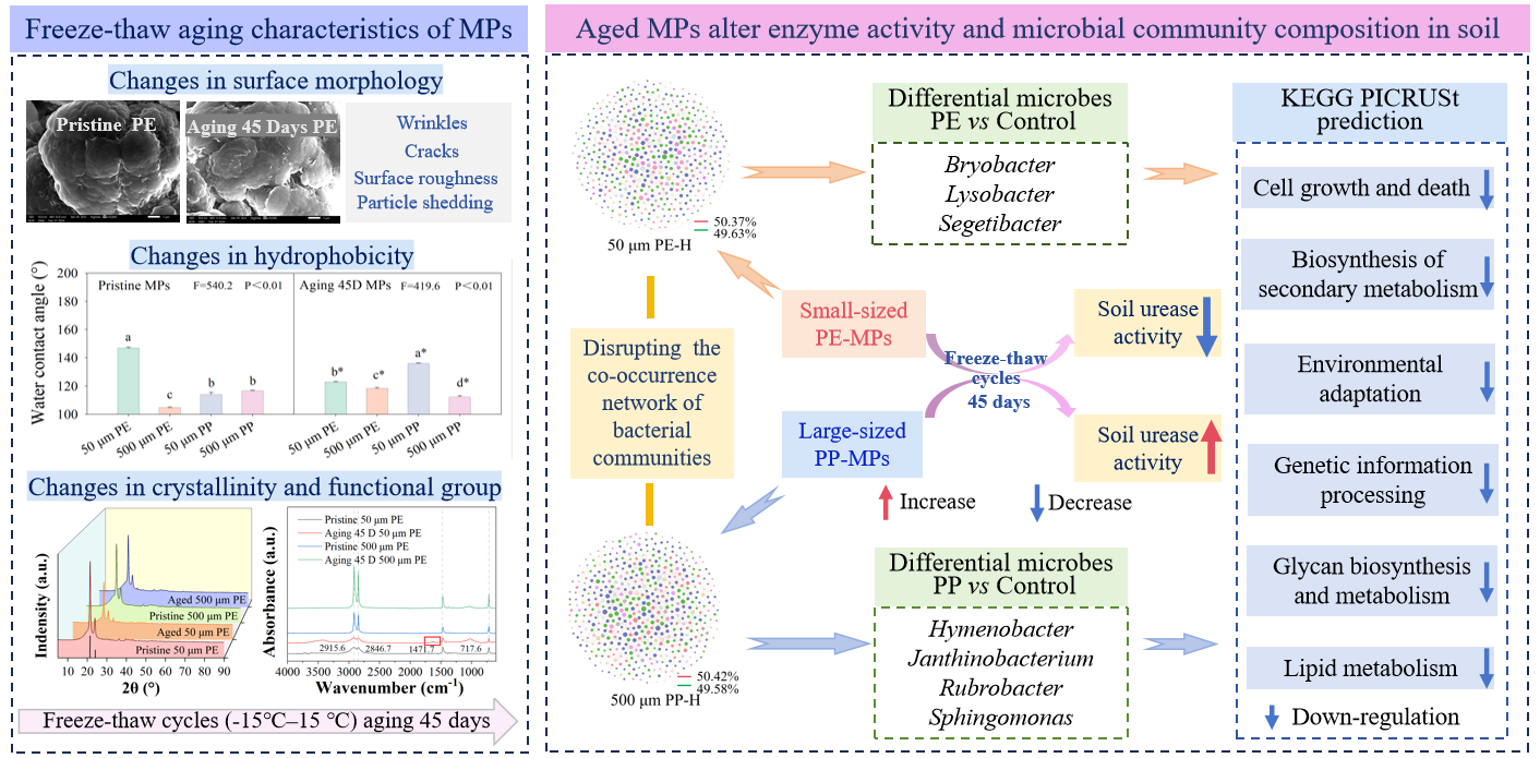 針對寒冷地區(qū)特有的凍融(FT)循環(huán)現(xiàn)象,該研究團(tuán)隊(duì)進(jìn)一步探索了FT老化后的MPs對土壤酶活性和微生物群落結(jié)構(gòu)的影響[4]。研究結(jié)果表明,FT老化后的MPs表面形貌和疏水性改變,結(jié)晶度降低。小粒徑的MPs抑制了土壤脲酶的活性,而大粒徑的MPs提高了土壤脲酶活性。FT老化的MPs顯著改變了土壤微生物的群落結(jié)構(gòu),增加了細(xì)菌群落共現(xiàn)網(wǎng)絡(luò)的復(fù)雜性。FT老化后的MPs還會影響遺傳信息和細(xì)胞過程,并破壞次級代謝產(chǎn)物的生物合成。