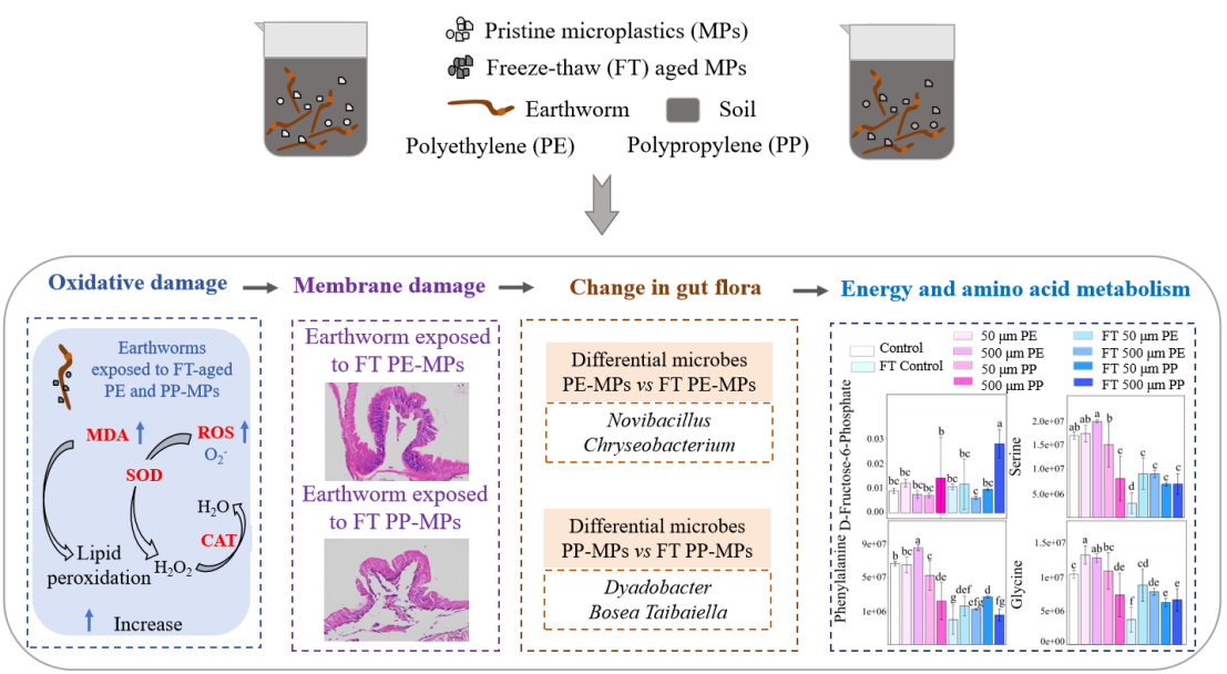 與此同時,該團(tuán)隊(duì)還揭示了FT老化的MPs對蚯蚓的毒性作用機(jī)制[5]。結(jié)果發(fā)現(xiàn),FT老化的聚丙烯(PP)MPs比原始PP-MPs對蚯蚓造成更嚴(yán)重的氧化應(yīng)激和膜損傷。FT老化的MPs會導(dǎo)致蚯蚓腸道菌群失衡并富集具有塑料降解能力的微生物屬。與原始的聚乙烯(PE)MPs和PP-MPs相比,FT老化的PE-MPs通過上調(diào)脂質(zhì)和類脂分子來影響膜轉(zhuǎn)運(yùn),而FT老化的PP-MPs通過下調(diào)有機(jī)雜環(huán)化合物來改變外源物質(zhì)的生物降解和代謝。