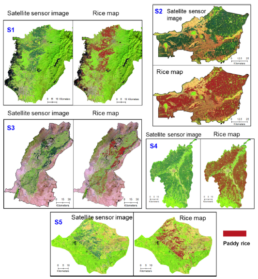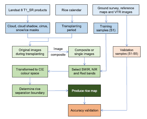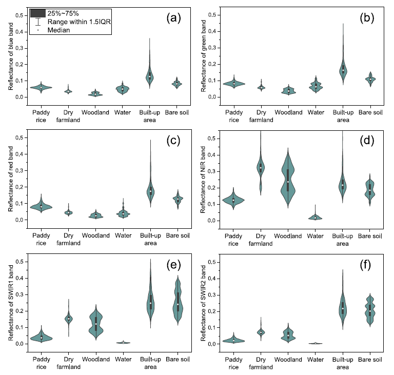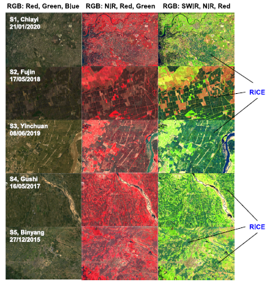 針對(duì)以上科學(xué)難題,中國(guó)科學(xué)院東北地理所李華朋副研究員帶領(lǐng)團(tuán)隊(duì),首次研發(fā)了一種全新的方法,命名為RiceTColour,旨在基于水稻在移栽期間的獨(dú)特光譜特征開展水稻遙感制圖。通過(guò)分析水稻和其他土地覆蓋在可見光、近紅外和短波紅外波段的光譜分布特征,首次發(fā)現(xiàn)水稻在移栽期近紅外和短波紅外反射率值低于其他地物類型(除水體)的獨(dú)特特征;進(jìn)而,使用短波紅外、近紅外和紅色波段組合,水稻田在遙感影像上呈現(xiàn)獨(dú)特的顏色。