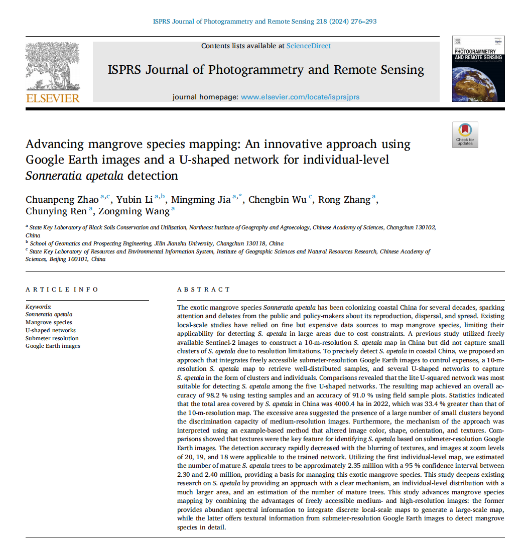 無瓣海桑(Sonneratia apetala)是紅樹林優良喬木樹種,為了恢復因沿海開發而受損的紅樹林,該紅樹林樹種已在中國被廣泛引種以用于造林和再造林。然而,無瓣海桑具有一定的競爭和擴散能力,其潛在的入侵能力引起了我國學者的廣泛擔憂和關注。中國科學院東北地理所地理景觀遙感學科組的趙傳朋和賈明明副研究員為解決遙感影像成本限制對精細化紅樹林物種制圖的影響,提出了將亞米分辨率谷歌地球影像和深度學習相結合的無瓣海桑提取新方法,發表論文“Advancing mangrove species mapping: An innovative approach using Google Earth images and a U-shaped network for individual-level Sonneratia apetala detection”。應用上述方法,以公開且免費獲取的谷歌地球影像為數據源,建立亞米分辨率的2022年中國無瓣海桑空間分布數據集。