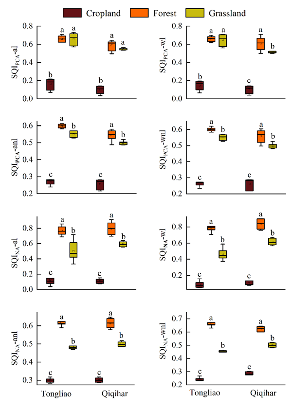 本研究通過NA和PCA法量化土壤質量指數(Soil Quality Index,SQI),以探究土地利用類型(農田、林地和草地)對中國東北風蝕區(通遼的科爾沁沙地和齊齊哈爾的松嫩沙地)的SQI的影響。為了選擇最小數據集(MDS),共測量了27個土壤物理、化學和生物性質,并使用加法、加權方法以及線性、非線性評分函數在兩個研究地點各確定了8組SQI值。