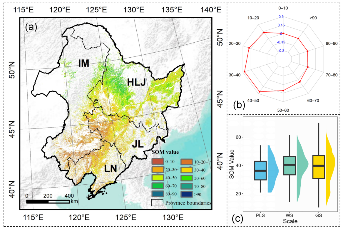 圖1.(a)東北黑土區SOM空間分布(HLJ:黑龍江:JL:吉林;LN:遼寧;IM:內蒙古);(b)不同含量有機質區域面積占比;(3)不同尺度下SOM含量平均值