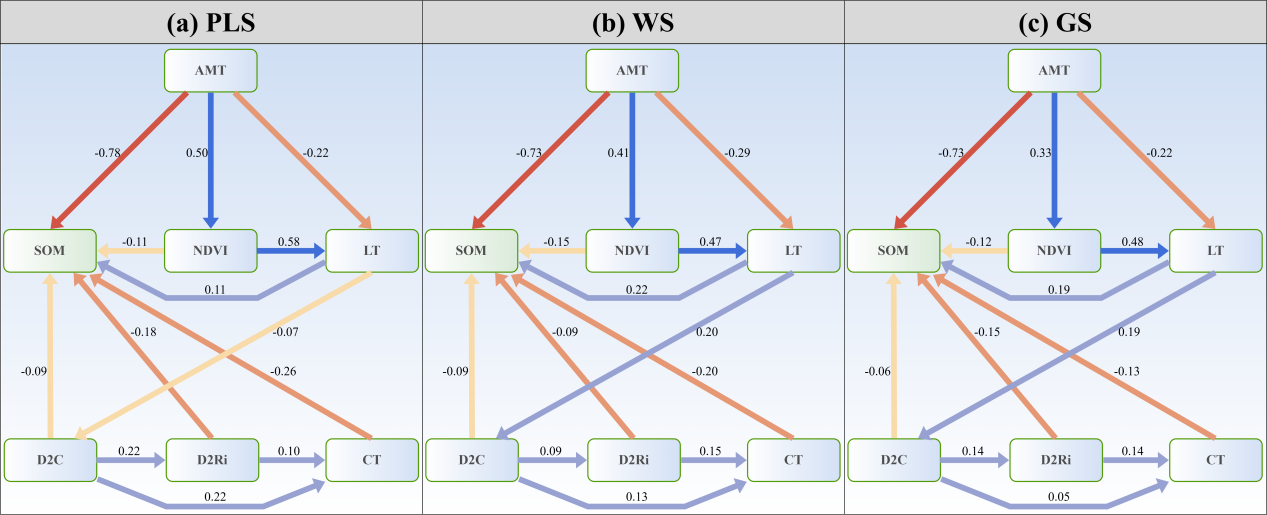 圖2. 結構方程模型展示了不同尺度下各驅動因素對SOM的直接影響和間接影響