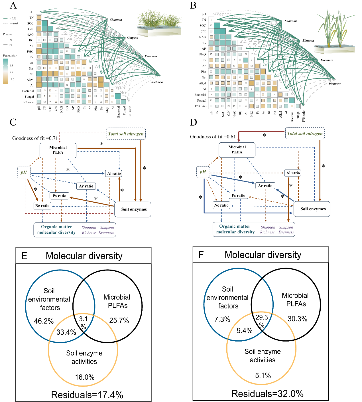 結(jié)果表明,分子多樣性(Shannon和Richness)在天然濕地和稻田土壤中均隨著有機碳含量的增加而增加,而土壤碳礦化速率則隨著分子多樣性的增加而降低。這表明,即使在厭氧或者周期性厭氧的環(huán)境中,分子多樣性與有機碳之間的正相關(guān)關(guān)系也沒有脫鉤。因此,SOM的分子多樣性可以作為土壤碳庫可持續(xù)性的指標(biāo)。微生物生物量和酶活性特征是影響土壤碳動態(tài)和分子多樣性的重要因素。分子多樣性在濕地墾殖后隨著土壤有機碳的損失而降低。與天然濕地相比,水稻土壤中脂肪族和烷基化合物的相對比例下降,含氮化合物的相對比例增加。此外,盡管水稻土中存在較大比例的難降解碳(酚類和芳香族),但土壤碳礦化率卻在增加,分子多樣性在抑制土壤礦化率方面發(fā)揮了積極作用。我們的研究為理解開墾影響下的濕地土壤有機碳動態(tài)提供了一個基于分子多樣性的視角。