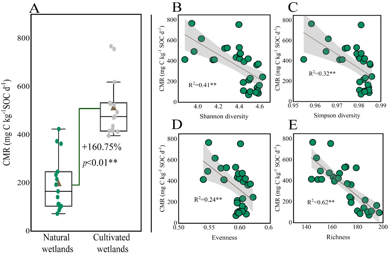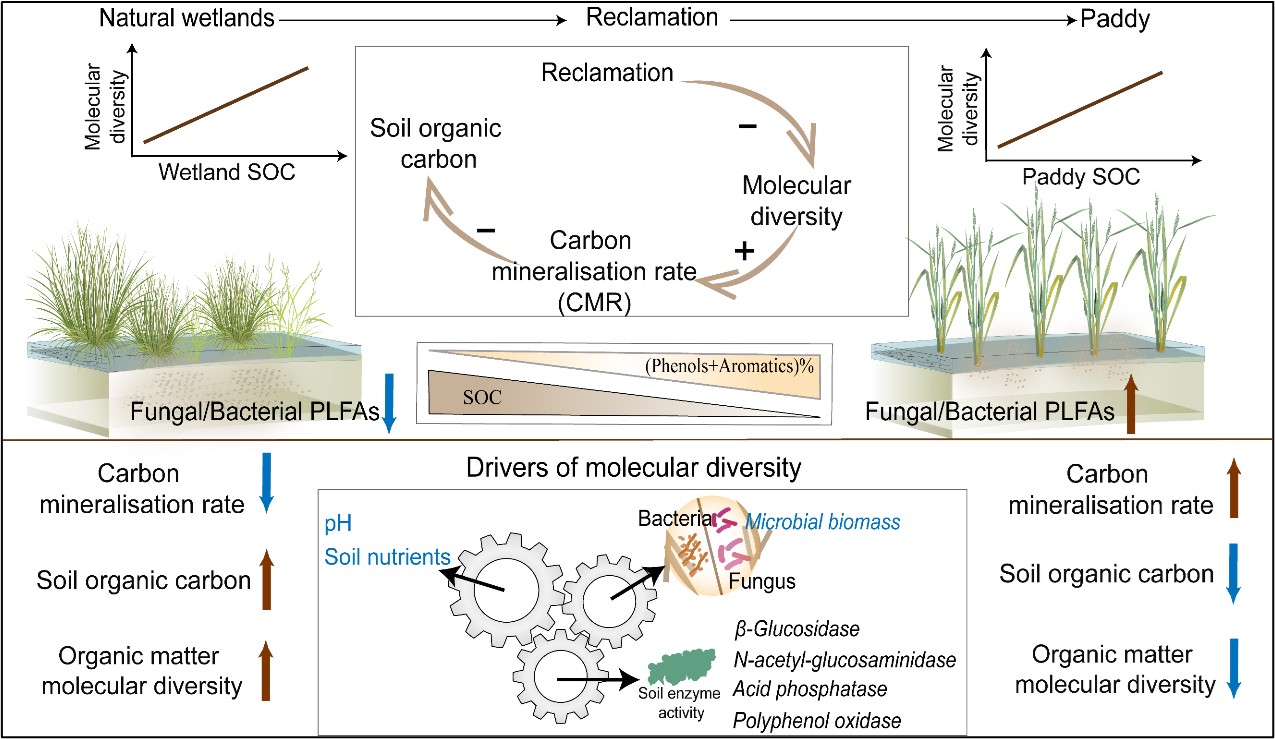 圖3 本研究的概念圖。在濕地和水稻田土壤中,分子多樣性隨著土壤有機碳含量的增加而增加。此外,盡管稻田土壤中存在較大比例的難分解碳,但土壤碳礦化速率仍在增加。概念模型揭示了濕地開墾對土壤碳庫可持續(xù)管理的潛在風(fēng)險。