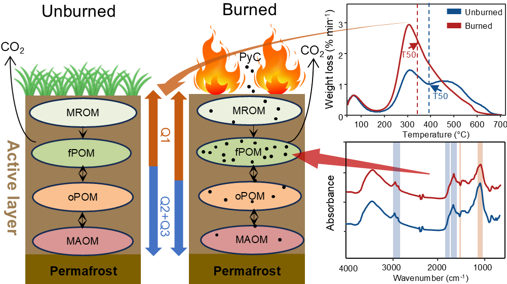 與此同時,連續低強度的計劃火燒降低了多年凍土區泥炭地的土壤碳穩定性,火后熱解碳的輸入成為泥炭土壤輕組碳組分的一部分,并主要保留在fPOM組分中(圖 3)。進一步化學分析表明,計劃火燒導致fPOM碳成分變化,火燒區的fPOM中芳香度增加了32%,這意味著泥炭土壤fPOM組分的穩定性明顯增加。然而,連續火燒后泥炭土壤熱穩定性下降,表現為Q1比例增加以及T50降低,計劃火燒通過改變fPOM碳組成,影響了土壤熱穩定性。而盡管增加了fPOM中芳香族化合物含量,但同時也促使土壤酶活性和二氧化碳的排放量的增加,對土壤碳穩定性產生了十分復雜的影響。