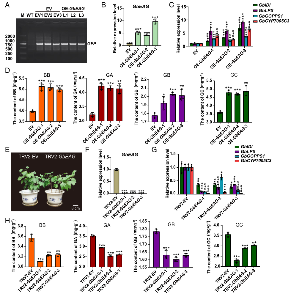 圖3. GbEAG過表達/沉默銀杏根中銀杏內酯生物合成相關基因的表達及其含量變化