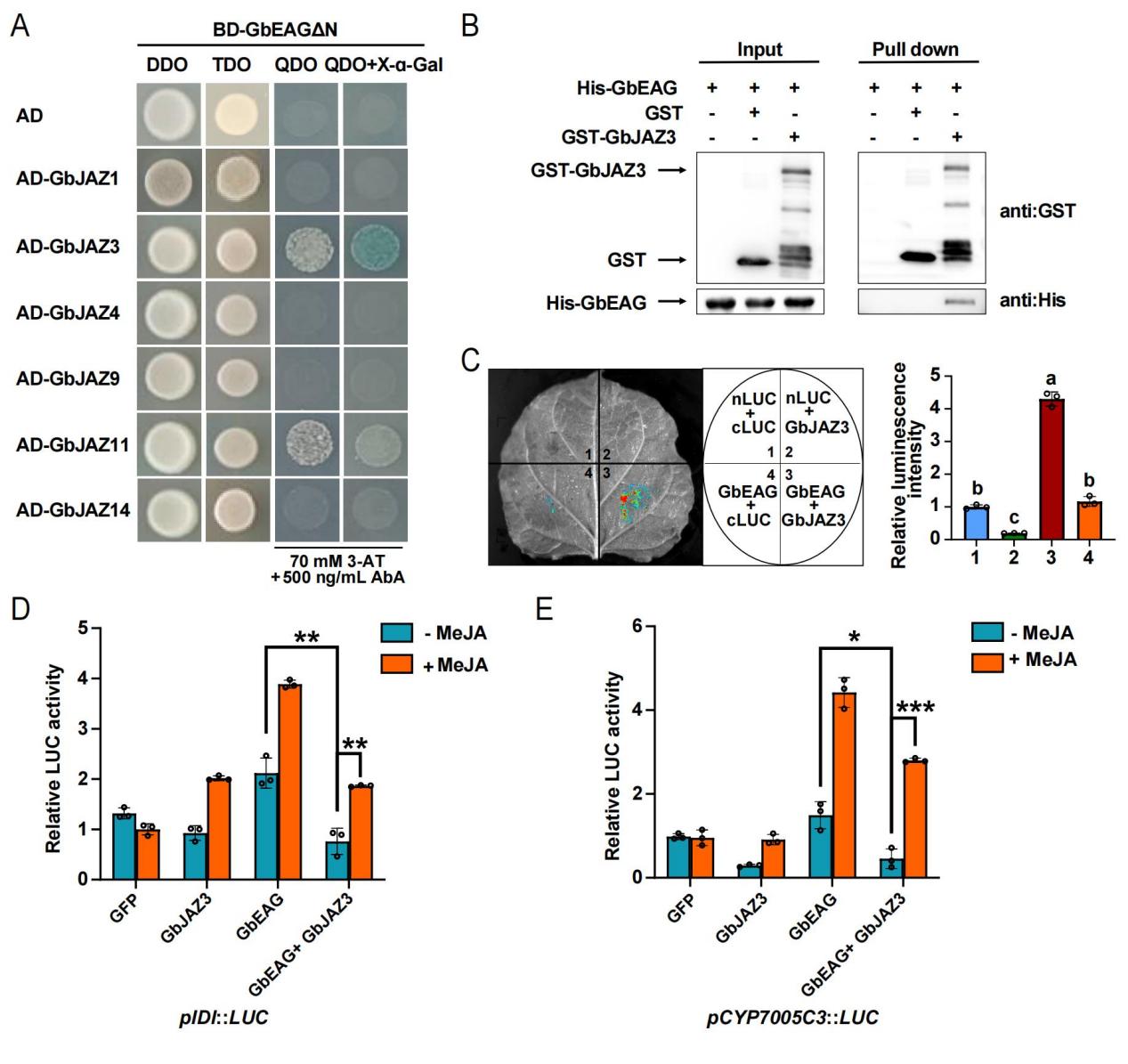 作者進一步通過酵母雙雜(Y2H)、下拉(Pull-down)及雙螢火素互補實驗(SLC),篩選到一個與GbEAG互作的核蛋白GbJAZ3,該蛋白是JA通路的關鍵抑制因子。在本氏煙草葉片中,將GbEAG和GbJAZ3二者分別與GbIDI、GbCYP7005C3的啟動子序列進行共表達,發現GbJAZ3抑制了GbEAG對GbIDI和GbCYP7005C3的轉錄激活;而體外施加MeJA則緩解了這種抑制作用。以上結果表明,GbEAG通過與GbJAZ3直接互作參與茉莉酸通路,同時GbJAZ3以JA依賴性方式調節GbEAG的轉錄活性。