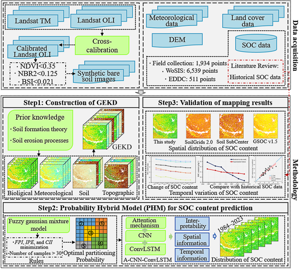 為了應(yīng)對(duì)這些挑戰(zhàn),中國(guó)科學(xué)院東北地理與農(nóng)業(yè)生態(tài)研究所農(nóng)業(yè)遙感學(xué)科組研究人員收集了8984個(gè)土壤樣本、956423張Landsat TM/OLI遙感影像、數(shù)字高程模型和氣象數(shù)據(jù),開發(fā)了一個(gè)考慮土壤形成與侵蝕過程的地理知識(shí)數(shù)據(jù)集(GEKD)。該數(shù)據(jù)集被輸入概率混合模型(PHM)進(jìn)行區(qū)域劃分,并進(jìn)一步結(jié)合注意力機(jī)制、卷積神經(jīng)網(wǎng)絡(luò)與長(zhǎng)短期記憶網(wǎng)絡(luò)(A-CNN-ConvLSTM)構(gòu)建高精度SOC預(yù)測(cè)模型。