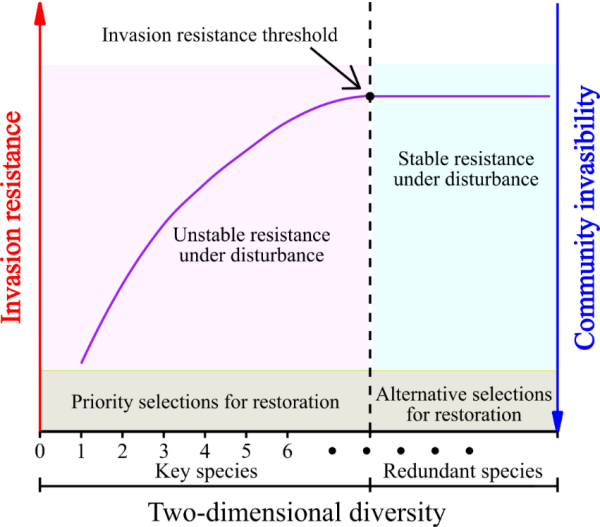 圖2 兩維度多樣性對本地群落入侵抵抗力的可能作用。當(dāng)本地群落達(dá)到入侵抵抗力閾值后,繼續(xù)增加兩維度多樣性不會(huì)增加入侵抵抗力。在達(dá)到這個(gè)閾值前,系統(tǒng)的入侵抵抗力在干擾下不穩(wěn)定,并且重要物種的喪失會(huì)降低入侵抵抗力