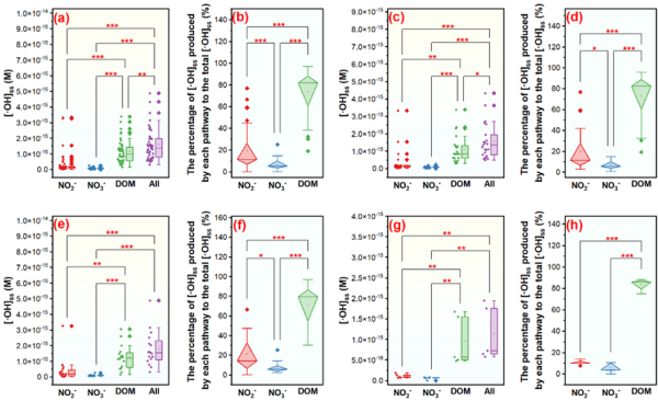 研究發(fā)現(xiàn),RIs的生成與水體中常規(guī)理化指標(biāo)之間存在復(fù)雜的相互作用關(guān)系(圖1)。單線態(tài)氧(1O2)的生成對pH較為敏感,三重激發(fā)態(tài)DOM(3DOM*)主要受鹽分調(diào)節(jié),而羥基自由基(?OH)受NO2-、NO3-和DOM的影響更大;水體中的磷對RIs呈現(xiàn)出雙重調(diào)節(jié)作用:一方面RIs穩(wěn)態(tài)濃度隨著TP濃度升高而增加;另一方面,過量的磷則會通過競爭性抑制作用降低RIs的量子產(chǎn)率。?OH作為自然界中最普遍存在且氧化能力最強(qiáng)的活性氧物種,其生成過程與1O2和3DOM*相比更為復(fù)雜。因此,本研究進(jìn)一步探究了?OH的主要生成過程與潛在機(jī)制。結(jié)果表明,NO2-、NO3-和DOM的光化學(xué)反應(yīng)對?OH生成的貢獻(xiàn)率分別為19.50%、6.93%和73.57%,證實DOM光解是鹽堿化農(nóng)業(yè)水體中?OH的主要生成途徑(圖2)。光譜學(xué)特征分析表明,在鹽堿化農(nóng)業(yè)水體中,相較于DOM濃度,其平均分子量對RIs生成的影響更大。整體而言,鹽堿化地區(qū)農(nóng)業(yè)水體從源頭經(jīng)由溝渠流入下游河湖水體的過程中,DOM光解始終是?OH的主要生成途徑,且在下游水體中占比最高(83.28%);NO2-和NO3-光解的貢獻(xiàn)相對較小,且在下游水體中兩者對?OH生成的貢獻(xiàn)占比均降低。