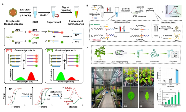 圖1. (A)比率信號擴(kuò)增輸出窗口、(B)橋聯(lián)探針識別SNP以及(C)大豆基因組提取與檢測示意圖