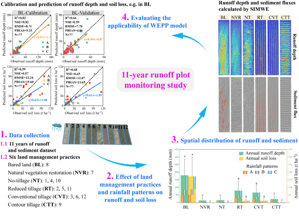 土壤侵蝕作為土地退化的核心驅動因素,對全球農業(yè)可持續(xù)發(fā)展構成嚴峻挑戰(zhàn),尤其在中國東北黑土區(qū)等生態(tài)脆弱的重要糧食生產基地表現(xiàn)尤為突出。然而,針對不同土地管理措施的徑流和產沙的長期監(jiān)測研究很少,更缺乏用于減緩土地退化的模型校準和驗證研究。因此,深入研究不同土地管理措施對東北黑土區(qū)坡面徑流和泥沙的調控作用以及評估WEPP模型適用性具有重要的實踐意義,這對區(qū)域的水土保持措施優(yōu)化和土壤侵蝕預測具有重要作用。