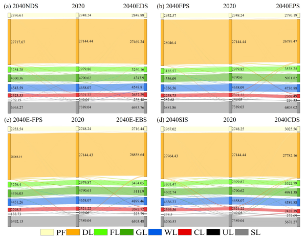圖2 2020-2040年不同情景下的土地利用轉移矩陣 (a)2020年與2040年自然發展情景和經濟發展情景土地轉移情況;(b)2020年與2040年耕地保護情景和生態保護情景土地轉移情況;(c)2020年與2040年生態耕地保護情景和生態經濟平衡情景土地轉移情況;(d)2020年與2040年鹽堿地改良情景和綜合發展情景土地轉移情況