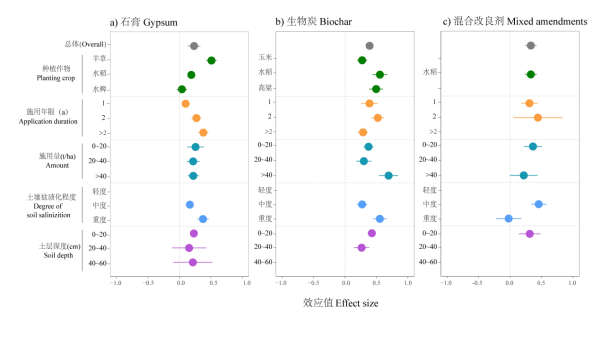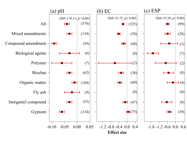 研究采用Meta分析方法,綜合了全國范圍內1992-2022年30年間公開發(fā)表的有關不同改良劑在鹽堿地改良效果上的相關報道,采納了有關田間試驗報道的92篇相關文獻中的2061組研究數據,綜合分析了當前國內鹽堿土改良劑的研究現狀,量化評估了不同類型改良劑對鹽堿土的改良效果,利用機器學習模型解析了影響改良劑應用效果的相關因素。