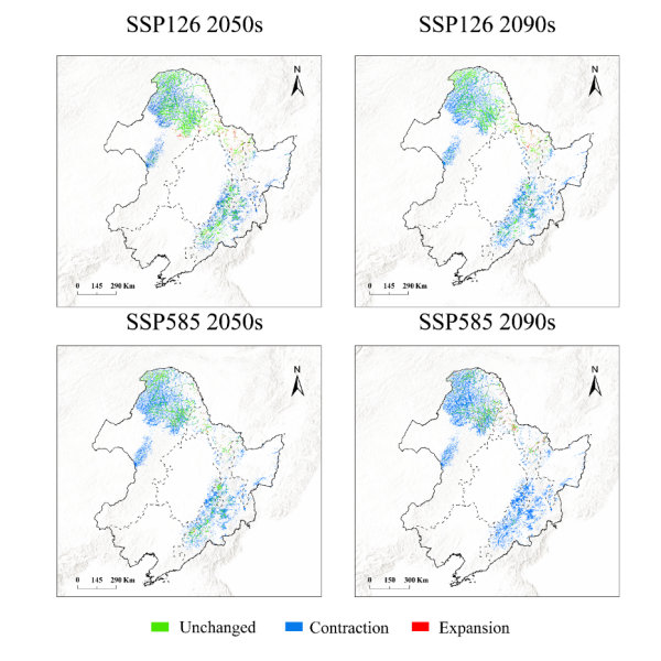 圖3 未來(lái)氣候情景下我國(guó)東北地區(qū)泥炭地潛在適宜分布區(qū)的變化