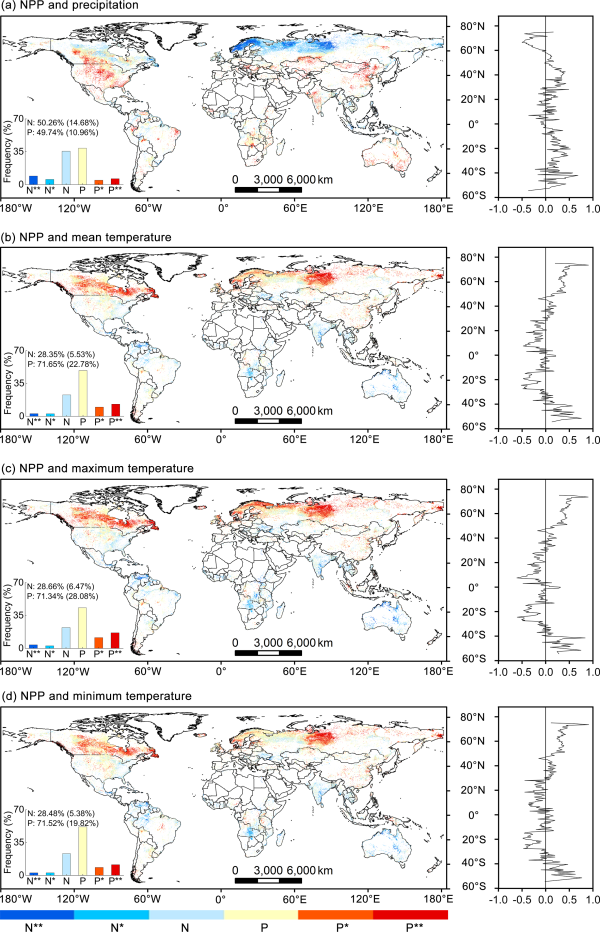 圖2 全球沼澤濕地植被凈初級(jí)生產(chǎn)力與氣候因子的相關(guān)性