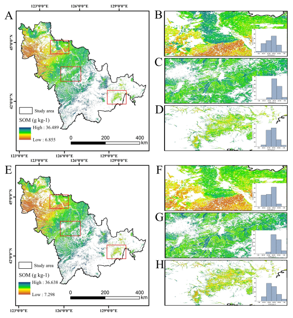圖2. 吉林省土壤有機(jī)質(zhì)(SOM)空間分布全局與局部回歸模型預(yù)測(cè)結(jié)果比較。A:全局回歸模型預(yù)測(cè)的SOM空間分布圖。B~D:A圖中選取的典型區(qū)域。E:局部回歸模型預(yù)測(cè)的SOM空間分布圖。F~H:E圖中選取的典型區(qū)域。B~D和F~H圖中的條形圖分別表示各區(qū)域內(nèi)不同SOM含量的比例