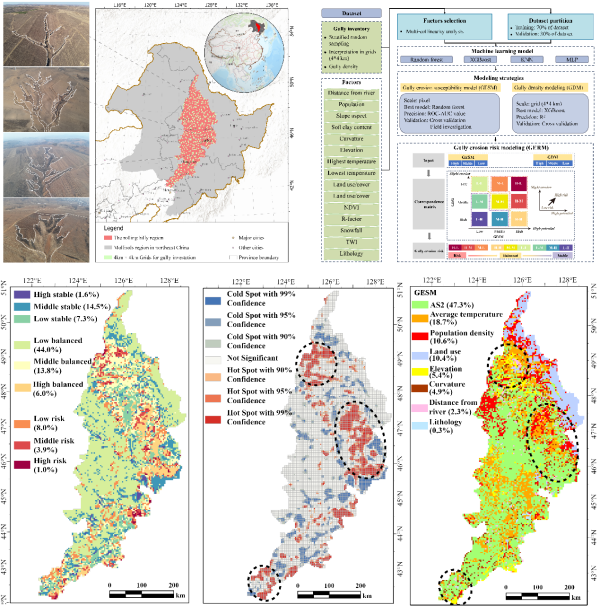 近日,東北地理所黑土退化與修復(fù)學(xué)科組郭明明研究團(tuán)隊(duì)提出了一種新的溝道侵蝕風(fēng)險模型構(gòu)建方法(GERM),該方法將溝蝕敏感性模擬與溝道密度模擬相結(jié)合,預(yù)測了漫川漫崗黑土區(qū)全區(qū)(17.76萬 km2)的溝蝕發(fā)育風(fēng)險。研究采用分層隨機(jī)抽樣方法選取了424個4×4 km2區(qū)域,通過0.3~0.6 m分辨率Google Earth影像對樣方中的侵蝕溝進(jìn)行解譯,并抽取30%進(jìn)行實(shí)地調(diào)查以保證解譯精度。結(jié)果表明,漫川漫崗黑土區(qū)侵蝕溝平均長度為335.85 m,平均溝壑密度為250.35 m/km2。GERM綜合考慮了Random Forest、XGBoost、KNN以及人工神經(jīng)網(wǎng)絡(luò)四種機(jī)器學(xué)習(xí)模型,結(jié)果顯示XGBoost模型表現(xiàn)最佳(AUC=0.999)。全局莫蘭指數(shù)表明溝蝕風(fēng)險存在顯著的空間聚類特征,漫川漫崗黑土區(qū)溝蝕高風(fēng)險區(qū)面積占比高達(dá)12.9%,且這些風(fēng)險區(qū)分布于全區(qū)的中東部、西北部和南部。此外,氣候是驅(qū)動侵蝕溝形成的關(guān)鍵因素,地形和氣候共同決定了全區(qū)溝蝕強(qiáng)度的空間異質(zhì)性,而侵蝕溝未來進(jìn)一步發(fā)育的風(fēng)險則受控于地形、氣候和人類活動的綜合影響,其中匯水地形指數(shù)(AS2)、氣溫、人口密度、土地利用主控區(qū)域面積占比分別為47.3%、18.7%、10.6%、10.4%。南部風(fēng)險區(qū)主要受AS2影響,東部風(fēng)險區(qū)主要受AS2、氣溫、土地利用影響,東北部向小興安嶺過渡地帶溝蝕風(fēng)險主要受人類活動強(qiáng)度(土地利用和人口密度)的影響,而西北部風(fēng)險區(qū)受控因素更為復(fù)雜多樣。研究結(jié)果可為東北黑土區(qū)侵蝕溝防控與治理提供科學(xué)依據(jù)。