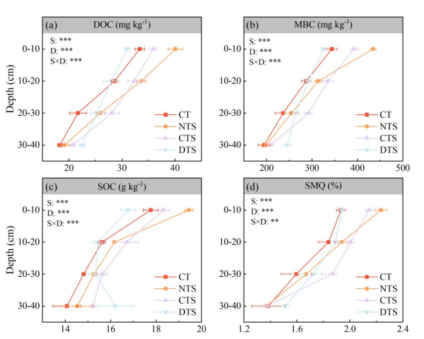 東北地理所黑土保護與利用學(xué)科組研究人員基于不同耕作方式耦合秸稈還田的長期定位試驗,系統(tǒng)研究了0-10、10-20、20-30和30-40 cm土層中SMQ的垂直分布特征,進一步結(jié)合三維熒光和同步熒光光譜技術(shù)對DOM的熒光結(jié)構(gòu)進行表征,旨在闡明不同秸稈還田方式通過調(diào)控DOM特性提升SMQ的關(guān)鍵過程機制。