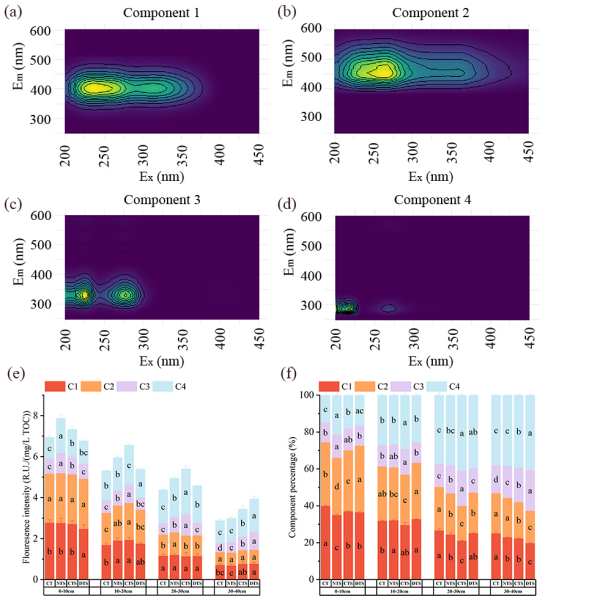 圖2. 不同秸稈還田處理下溶解性有機質(zhì)的熒光特征變化,基于三維熒光耦合平行因子分析(EEM-PARAFAC)識別到的四種共有熒光組分(a-d)及各組分的相對含量(e)和占比(f)