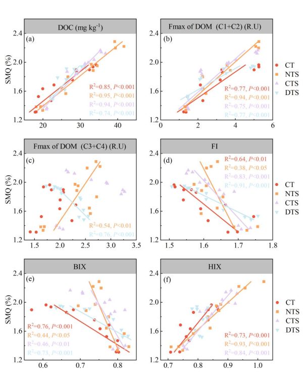 研究發(fā)現(xiàn),SMQ呈現(xiàn)隨土層深度增加而遞減的垂直分布規(guī)律。與對照秸稈不還田相比,秸稈還田處理顯著提高了0-40 cm土層的SMQ(圖1),其中秸稈覆混還田處理的提升效果最為顯著(11.60%)。此外,秸稈還田顯著增加了DOM的最大熒光強度,并提高其類腐殖質(zhì)組分的含量(圖2)。二維相關(guān)光譜分析進一步揭示,在秸稈覆蓋和覆混還田處理下,類蛋白質(zhì)樣熒光組分具有優(yōu)先變化級,而在秸稈深翻還田處理下,類腐殖質(zhì)樣熒光組分的變化則更優(yōu)先。線性回歸分析表明,SMQ與溶解有機碳(DOC)和DOM中類腐殖質(zhì)組分的含量均呈顯著正相關(guān)(圖3)。隨機森林分析表明,在0-20 cm土層,土壤胞外酶活性和養(yǎng)分是調(diào)控SMQ的主要因子;而在20-40 cm土層中,DOM特性(DOC和類腐殖質(zhì)組分)是驅(qū)動SMQ變化的主導(dǎo)因素。研究結(jié)果闡明了秸稈還田下DOM介導(dǎo)的SMQ垂直變化機制,為黑土區(qū)土壤質(zhì)量提升提供了新的科學(xué)依據(jù)。
