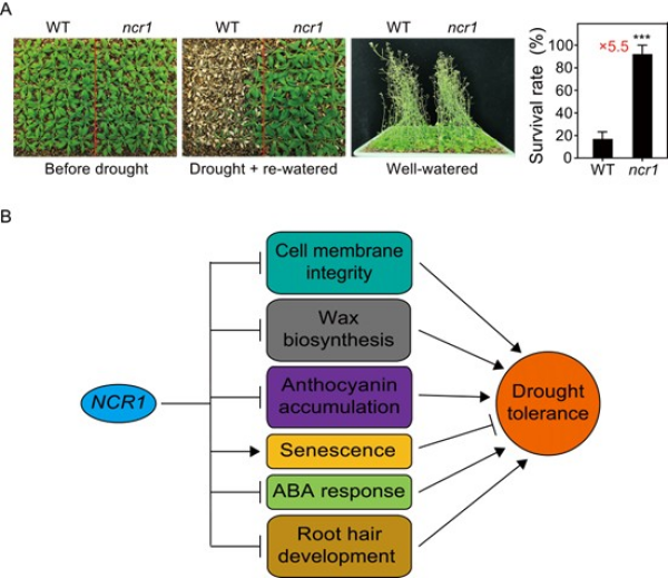 圖1. NCR1負向調控擬南芥耐旱性的生理表型及其分子機制