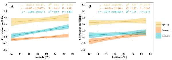 圖1 不同季節(jié)濕地植被LAI與晝夜地表溫度的相關(guān)系數(shù)隨緯度變化圖