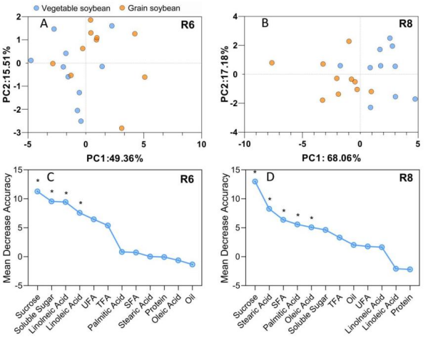 本研究選取了10個鮮食大豆和10個粒用大豆品種(系),對其營養(yǎng)成分進(jìn)行了全面比較。研究發(fā)現(xiàn),鮮食大豆在蔗糖、可溶性糖和粗蛋白含量上顯著高于粒用大豆,而在粗脂肪和總脂肪酸含量上則相對較低。在鮮莢階段,鮮食大豆含有較高比例的不飽和脂肪酸,尤其是油酸。通過主成分分析(PCA)和機器學(xué)習(xí)算法,發(fā)現(xiàn)鮮食大豆和粒用大豆在營養(yǎng)組成上存在明顯差異,并且蔗糖是區(qū)分鮮食大豆和粒用大豆的最關(guān)鍵營養(yǎng)標(biāo)志物(圖1)。
