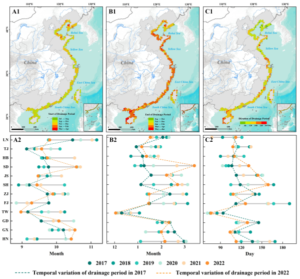 濱海養殖池是海岸帶生態系統和全球糧食生產體系的重要組成部分,對于保障全球糧食安全及沿海地區社會經濟發展至關重要。然而,濱海養殖池的快速擴張及其季節性排水引發了近海海域水質嚴重惡化,對海岸帶可持續發展構成嚴重威脅。已有研究缺乏對中國國家尺度濱海養殖池排蓄水周期的動態監測及其對近海水質影響的系統性解析,限制了我國海岸帶生態保育與區域可持續發展。