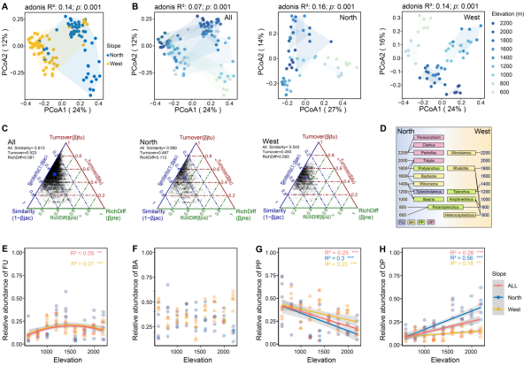 土壤線蟲在山地生態(tài)系統(tǒng)中發(fā)揮著重要生態(tài)功能,但其在不同海拔梯度上的分布格局及群落組裝機(jī)制仍存在諸多未解之處。針對(duì)這一科學(xué)難題,土壤物質(zhì)循環(huán)學(xué)科組等研究團(tuán)隊(duì)以長白山北坡和西坡為研究區(qū)域,共采集108份土壤樣品,覆蓋九個(gè)海拔高度(600-2200 m)。系統(tǒng)分析了線蟲總體群落及不同營養(yǎng)類型群落的空間相似性與組裝過程,并量化評(píng)估了海拔、環(huán)境距離和地理距離對(duì)群落空間變異及組裝機(jī)制的相對(duì)貢獻(xiàn)。