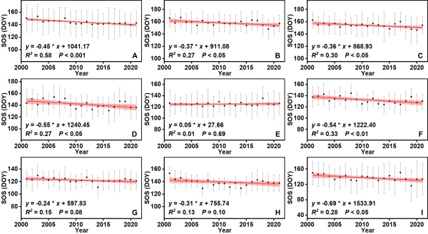 圖1中國(guó)濕地春季物候變化的時(shí)間趨勢(shì)