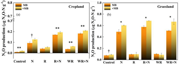 分析表明,低碳氮比的植物殘體易分解,能快速為微生物提供能量,促進反硝化過程;高碳氮比殘體則會增強微生物對氮素的固定,在農(nóng)田土壤中卻因微生物量增加而緩解了這一效應,反而促進了N?O排放。值得注意的是,在低碳農(nóng)田土壤中,微生物量的增加主要響應外源碳的輸入,微生物量碳的動態(tài)變化是主要控制因子。而碳含量較高的草地土壤對氮素添加更為敏感,其N?O排放因子顯著高于農(nóng)田土壤(圖2), 進一步證實微生物量氮和無機氮的動態(tài)變化是驅(qū)動其N?O排放的關鍵調(diào)控因子。研究成果不僅深化了對土壤碳氮循環(huán)與溫室氣體排放關系的科學認知,更為我國踐行 "雙碳"目標、推進農(nóng)業(yè)綠色低碳發(fā)展提供了新的技術路徑。