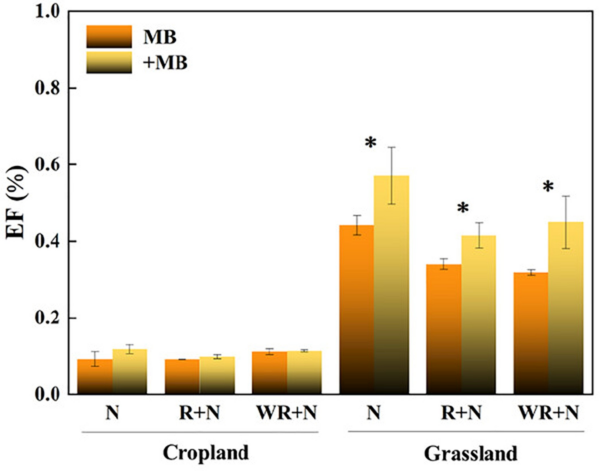 圖2土壤微生物量大小和植物殘體添加對農(nóng)田和草地土壤氧化亞氮排放因子(EF)的影響