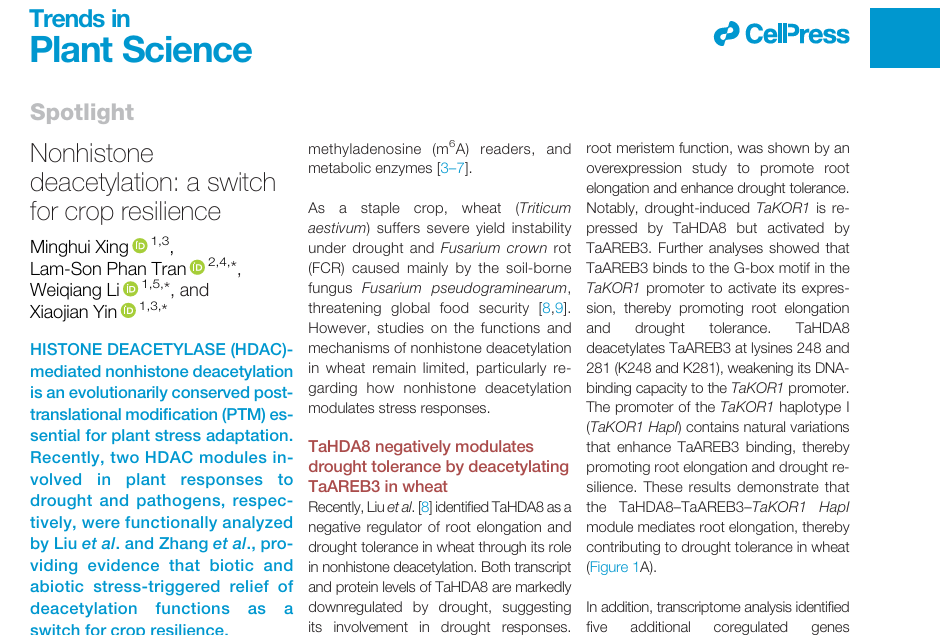 2, Xing M, Tran LP, Li W, Yin X. Nonhistone deacetylation: a switch for crop resilience. Trends in Plant Science. 2025 Dec 26:S1360-1385(25)00361-9. doi:10.1016/j.tplants.2025.12.007