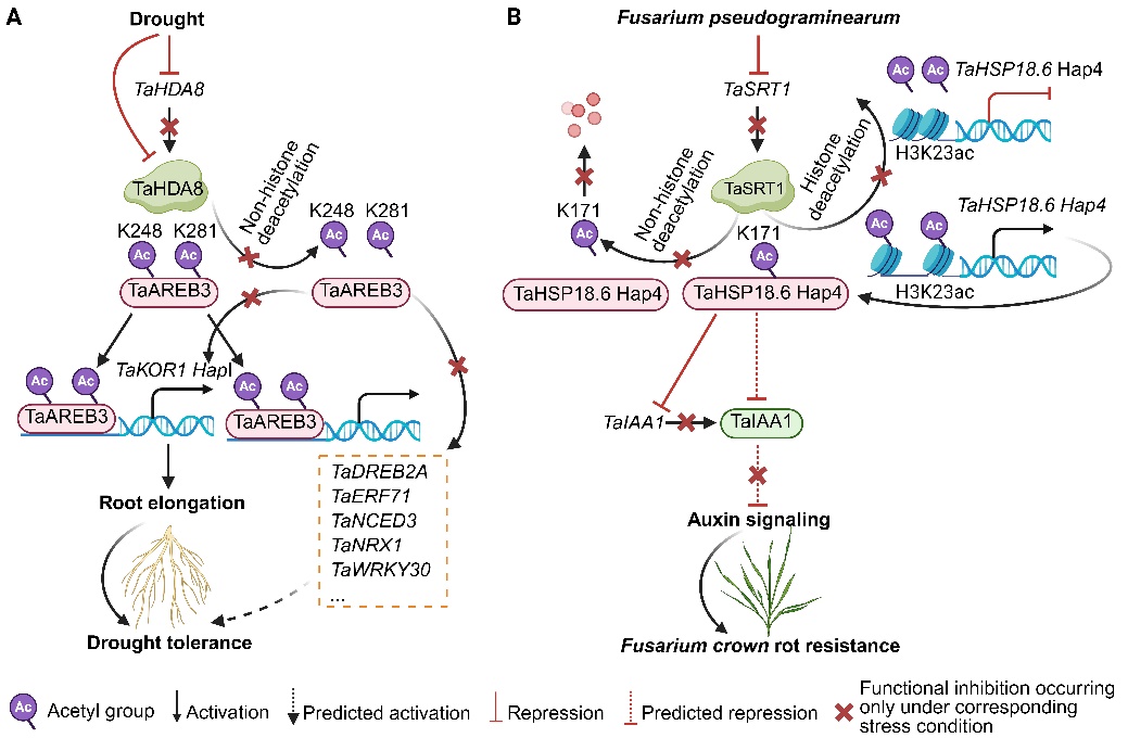 團(tuán)隊以Nonhistone deacetylation: a switch for crop resilience為題發(fā)表于Trends in Plant Science的 Spotlight文章指出,組蛋白去乙酰化酶(HDAC)介導(dǎo)的非組蛋白去乙酰化在作物逆境響應(yīng)中充當(dāng)重要的分子開關(guān)。在小麥中,組蛋白去乙酰化酶TaHDA8通過去乙酰化轉(zhuǎn)錄因子TaAREB3抑制根系伸長,從而負(fù)調(diào)控抗旱性,但干旱脅迫會抑制TaHDA8的蛋白豐度;組蛋白去乙酰化酶TaSRT1通過去乙酰化熱激蛋白TaHSP18.6抑制生長素信號,進(jìn)而負(fù)調(diào)控鐮刀菌冠腐病抗性,而病原侵染同樣會降低TaSRT1的蛋白豐度。由此,生物脅迫與非生物脅迫觸發(fā)的“去乙酰化作用解除”可作為提升作物抗逆性的調(diào)控開關(guān),為抗逆育種提供了可模塊化利用的新靶點。