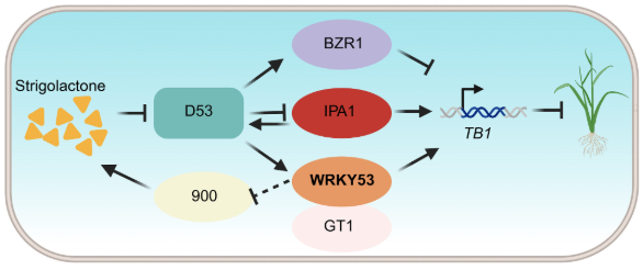 圖2. OsWRKY53調控水稻分蘗及微調獨腳金內酯信號的模式圖